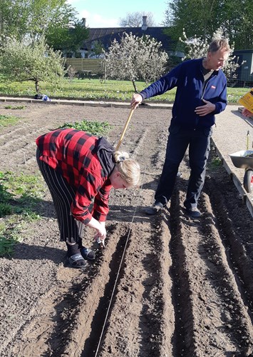 4H-klubben har et godt samarbejde med godsets gartner, som gik fælleshaverne igennem med en kultivator, mens familierne stadig ventede på at få lov til at så nyt i haven. Så da familierne mødtes for første gang i år, kunne de med det samme gå i gang med at lægge kartofler.
