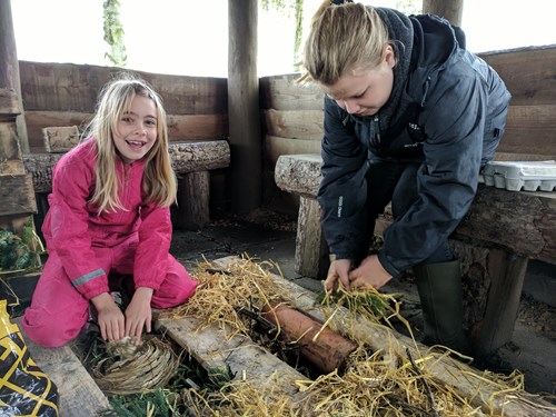 Her er to piger fra Aktivitetsgårdens 4H ved at bygge et insekthotel, hvor havens insekter kan hygge sig i løbet af vinteren.